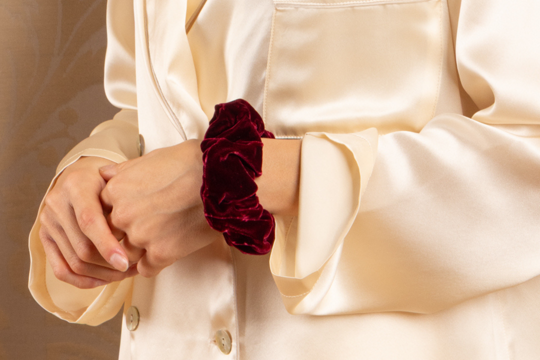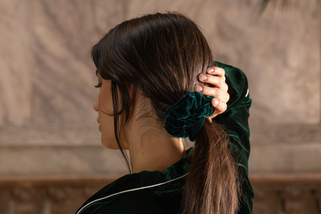 Crafted from soft velvet in tone with our slippers and pajamas collections, the Farnese scrunchie enriches the daily routine. Gentle on the hair and skin, it is a precious accessory, accompanying beauty rituals and adding a refined touch of style to every moment of the day