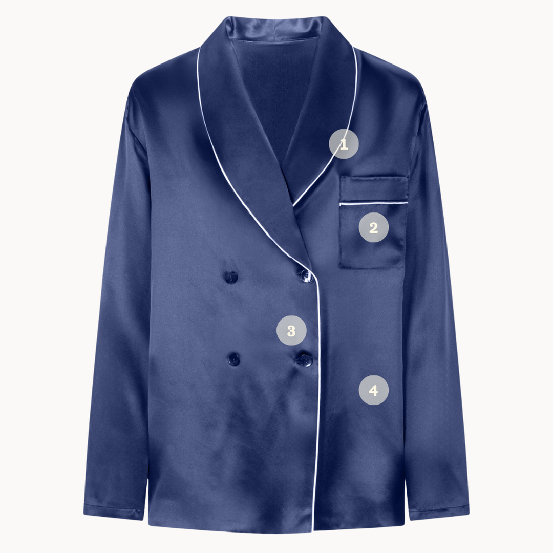 The Diamanti pajama set, composed of shirt and trousers, is crafted in soft Italian silk for complete, refined comfort. The double-breasted shirt features mother-of-pearl buttons and a chest pocket that can be personalized with embroidered initials, while the matching trousers offer a relaxed yet elegant cut in fluid silk. Designed for ease, sophistication, and subtle luxury, the set transforms everyday loungewear into a moment of effortless elegance.