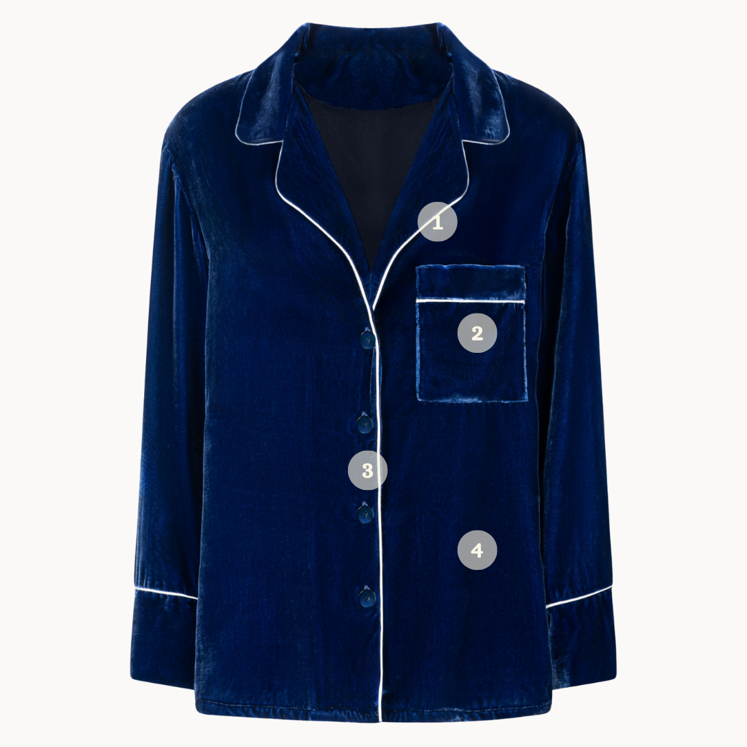 The Farnese pajama set, composed of shirt and trousers, is crafted in plush Italian velvet for complete, relaxed sophistication. The shirt features refined piping, mother-of-pearl buttons, and optional embroidered initials, while the matching trousers offer an effortless, fluid silhouette. Designed for warmth, ease, and quiet elegance, it elevates slow mornings and late evenings at home with refined leisure