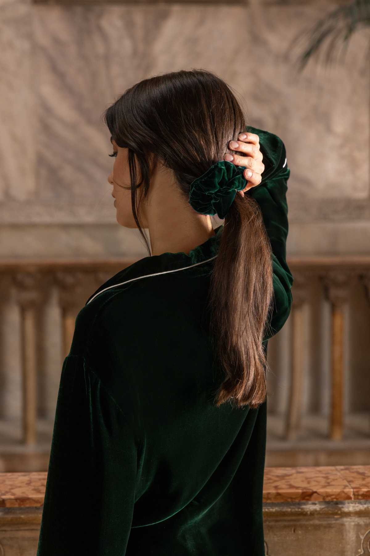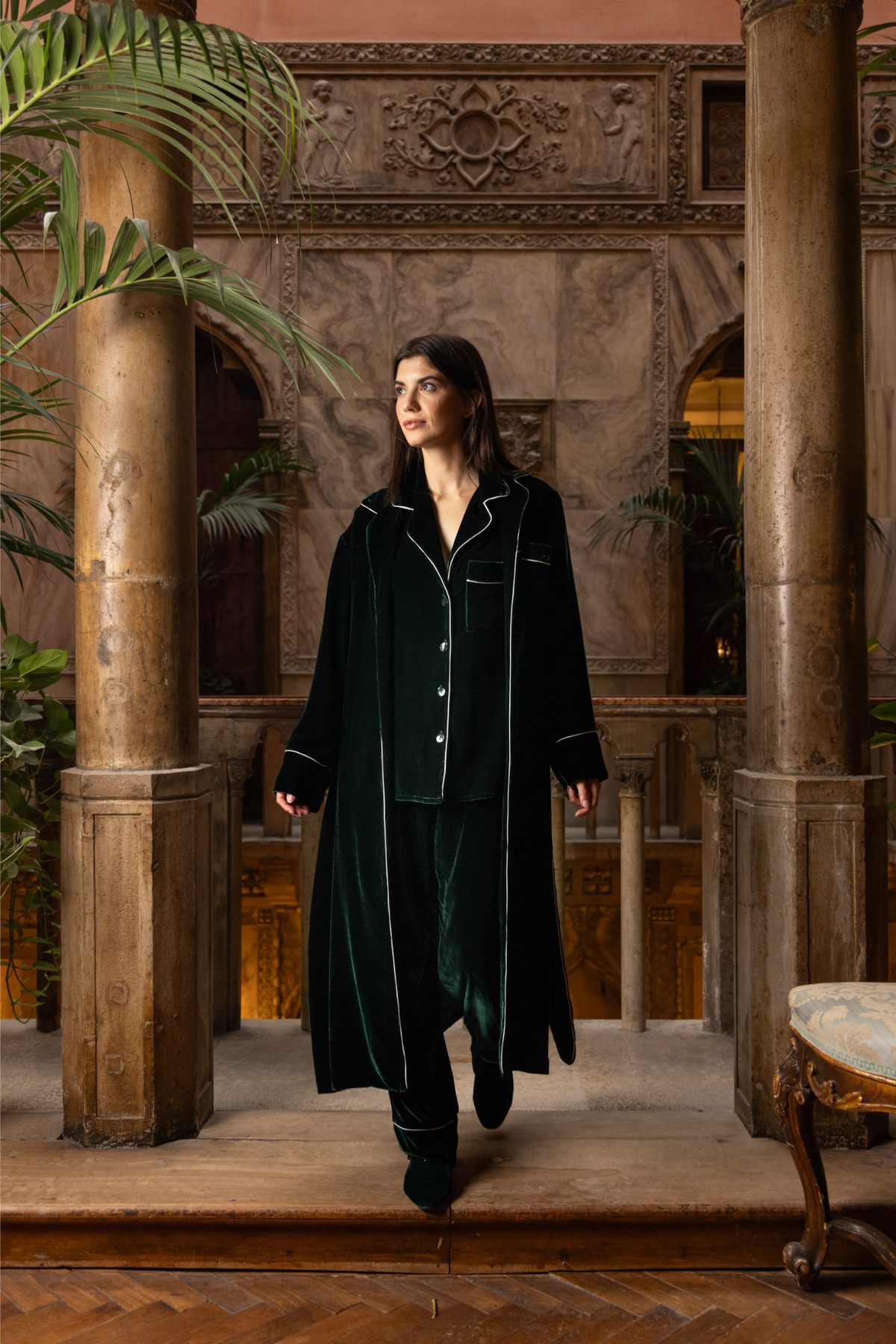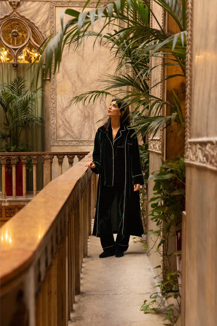 The Farnese pajama set, composed of shirt and trousers, is crafted in plush Italian velvet for complete, relaxed sophistication. The shirt features refined piping, mother-of-pearl buttons, and optional embroidered initials, while the matching trousers offer an effortless, fluid silhouette. Designed for warmth, ease, and quiet elegance, it elevates slow mornings and late evenings at home with refined leisure