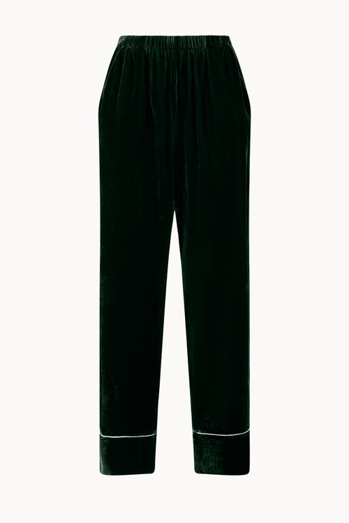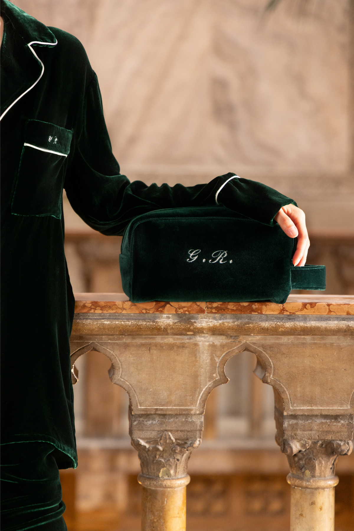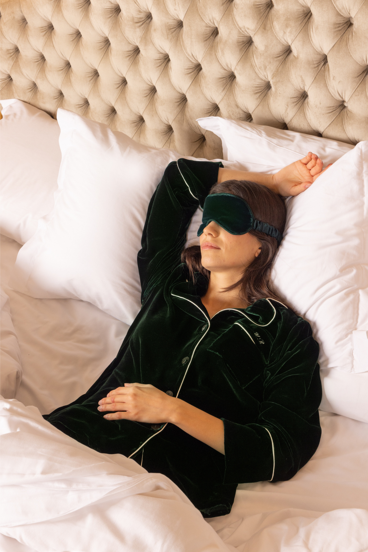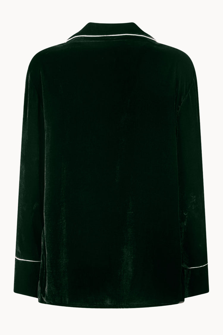 The Farnese pajama set, composed of shirt and trousers, is crafted in plush Italian velvet for complete, relaxed sophistication. The shirt features refined piping, mother-of-pearl buttons, and optional embroidered initials, while the matching trousers offer an effortless, fluid silhouette. Designed for warmth, ease, and quiet elegance, it elevates slow mornings and late evenings at home with refined leisure
