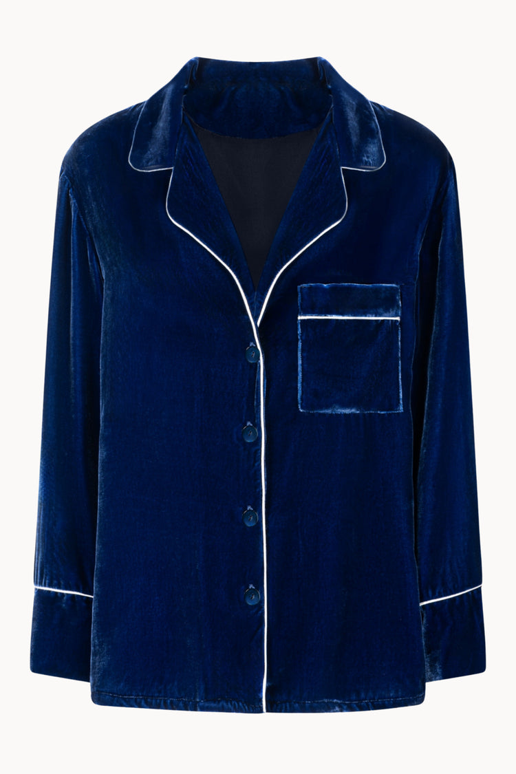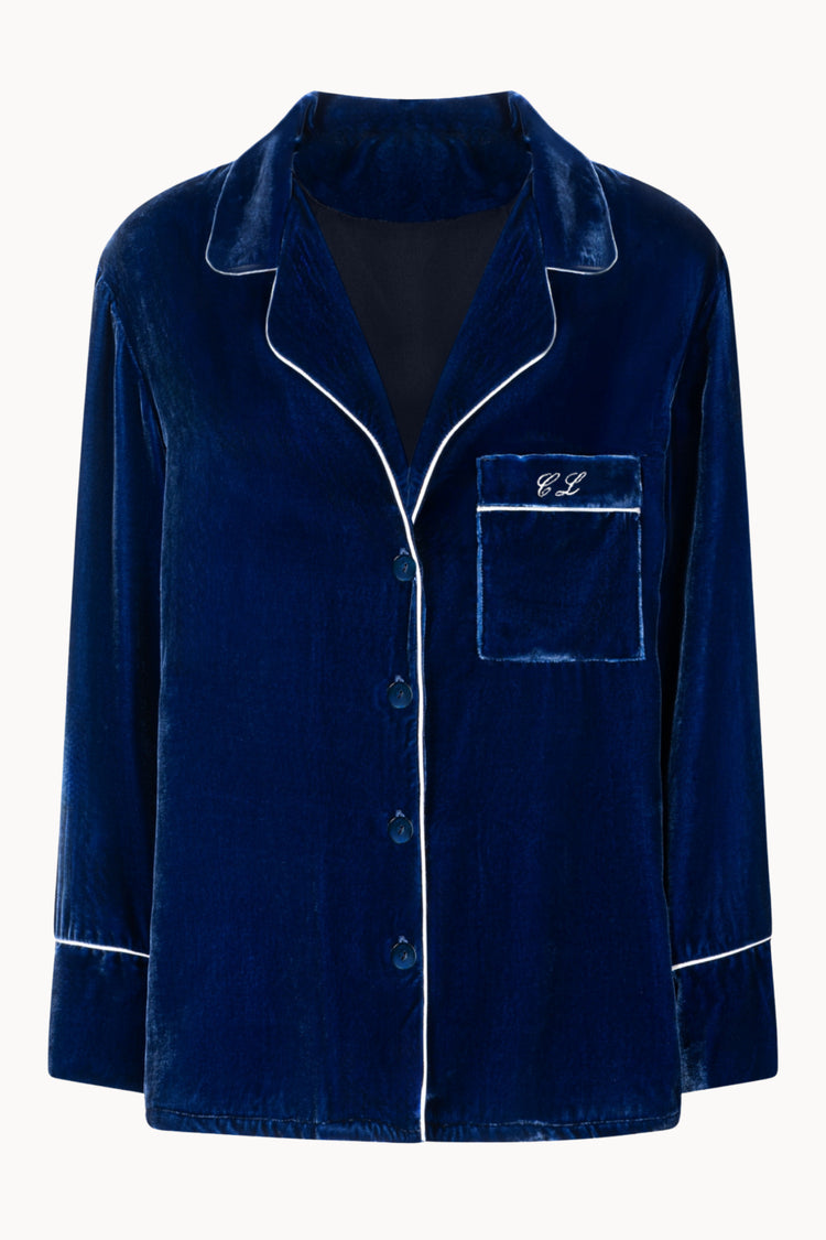 Designed for relaxed sophistication, the Farnese shirt reimagines classic nightwear through the soft touch of Italian velvet. Finished with mother-of-pearl buttons and refined piping, it can be personalized with embroidered initials on the chest pocket, an intimate detail of refined individuality.