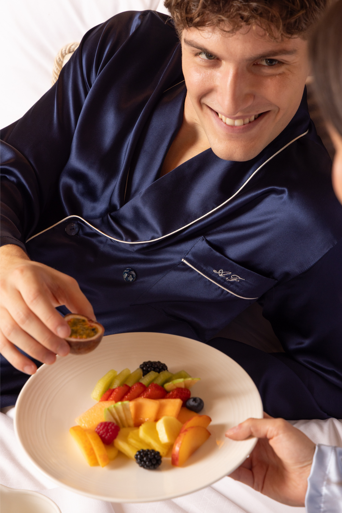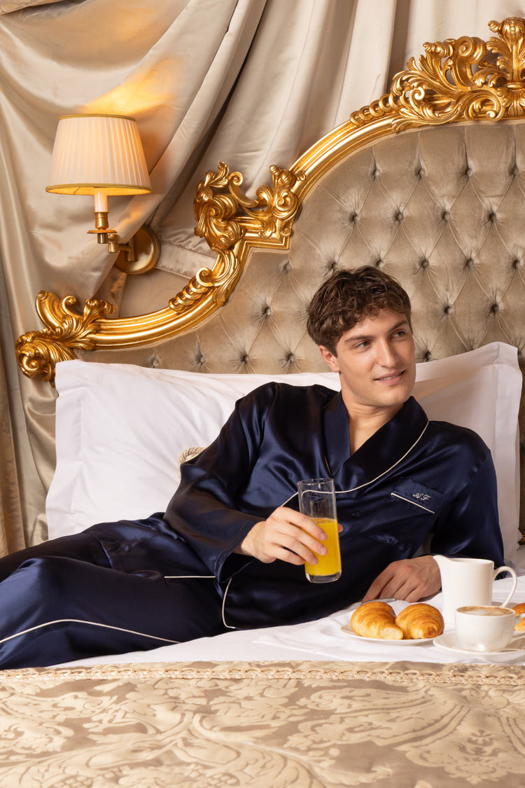Defined by its elegant double-breasted silhouette, the Diamanti shirt reflects the precision of Italian tailoring through the softness of silk. Detailed with mother-of-pearl buttons and a chest pocket that may be personalized with embroidered initials, it brings couture-inspired grace to the world of nightwear.