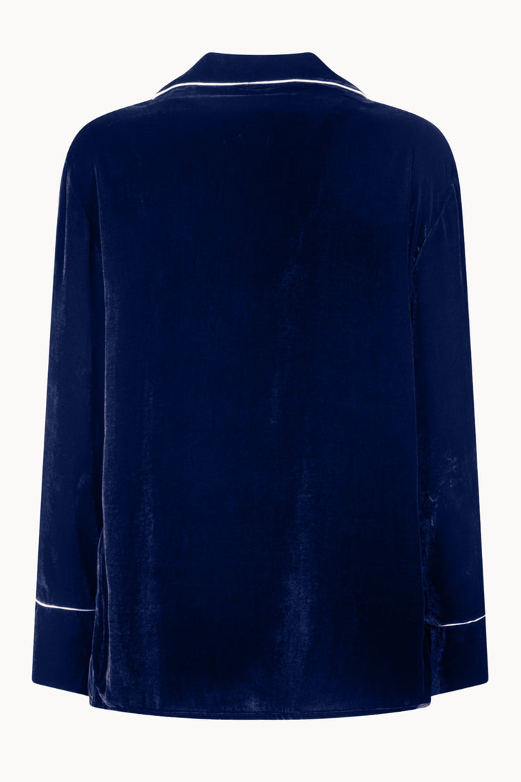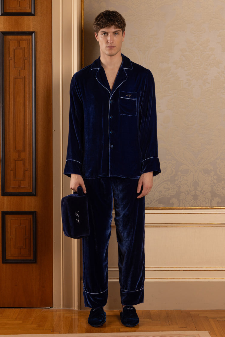 Designed for relaxed sophistication, the Farnese shirt reimagines classic nightwear through the soft touch of Italian velvet. Finished with mother-of-pearl buttons and refined piping, it can be personalized with embroidered initials on the chest pocket, an intimate detail of refined individuality.