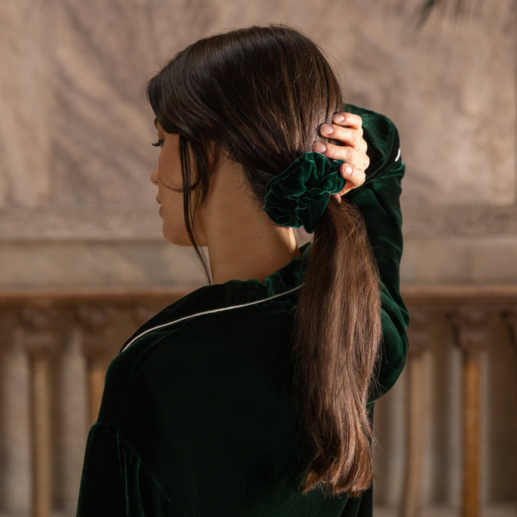 Crafted from soft velvet in tone with our slippers and pajamas collections, the Farnese Scrunchies Trio includes three scrunchies in the same elegant shade. Gentle on hair and skin, each piece is a precious accessory, accompanying beauty rituals and adding a refined touch of style to every moment of the day